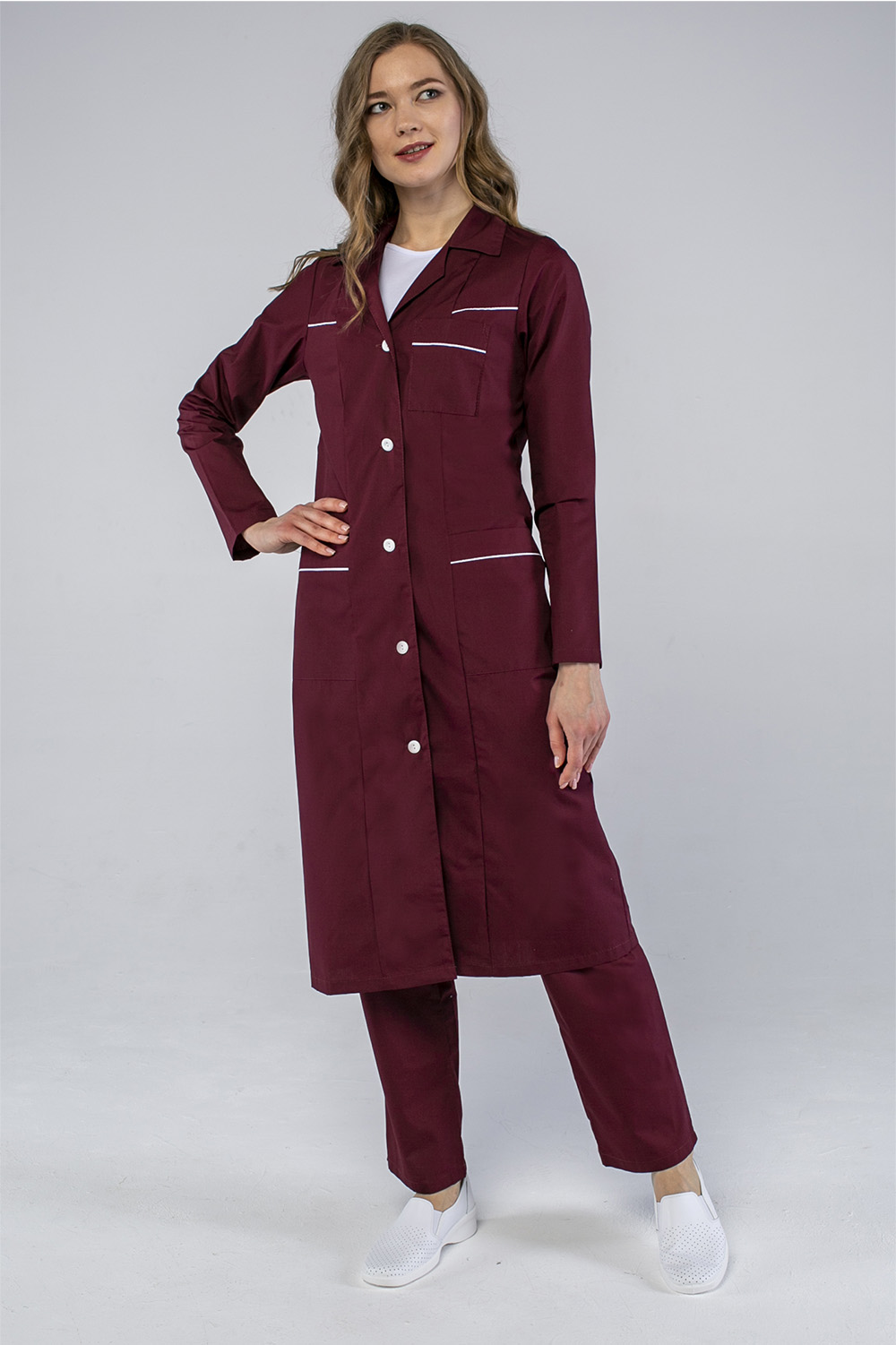 - контрастным белым кантом отделаны кокетка и карманы